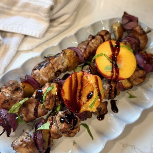 juicy Peach Balsamic Chicken Skewers grilled with fresh peaches and red onion, served over arugula with burrata and balsamic glaze (the kind of meal that looks fancy but takes no time at all),
