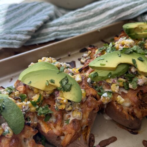 Easy to prep ahead: Roast the sweet potatoes and mix up the chicken and elote corn topping in advance. Just reheat and assemble.