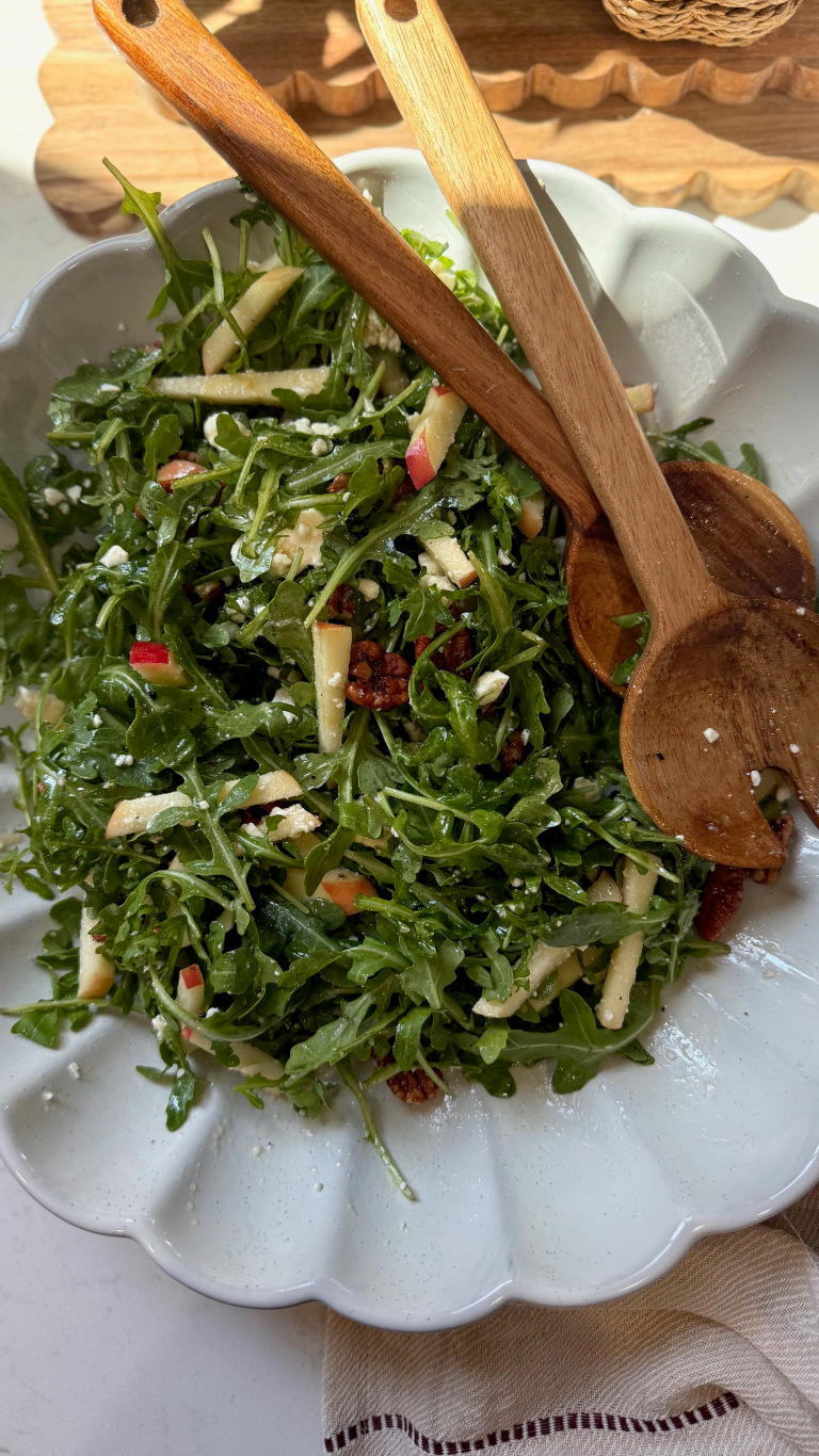 This crisp apple feta salad is the ultimate fall salad — made with arugula, sliced apples, canned pecans, creamy feta, and a simple honey apple