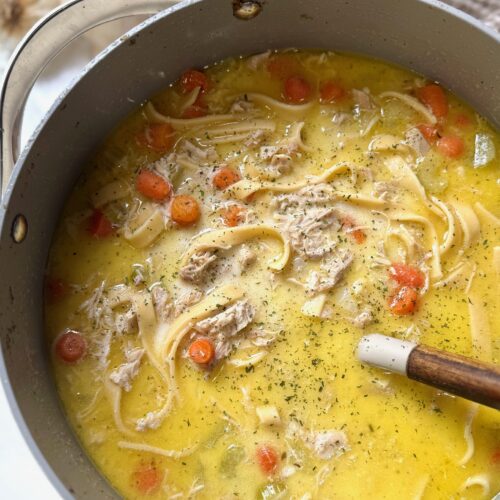 What I love about this version is that it’s completely homemade — no canned broth or shortcuts — yet it’s still simple enough for a weeknight. You start by simmering chicken thighs with water and a few pantry spices, which gives you the richest, most flavorful base. Once you build on that with sautéed veggies, noodles, and cream, you end up with the silkiest, dreamiest soup ever.