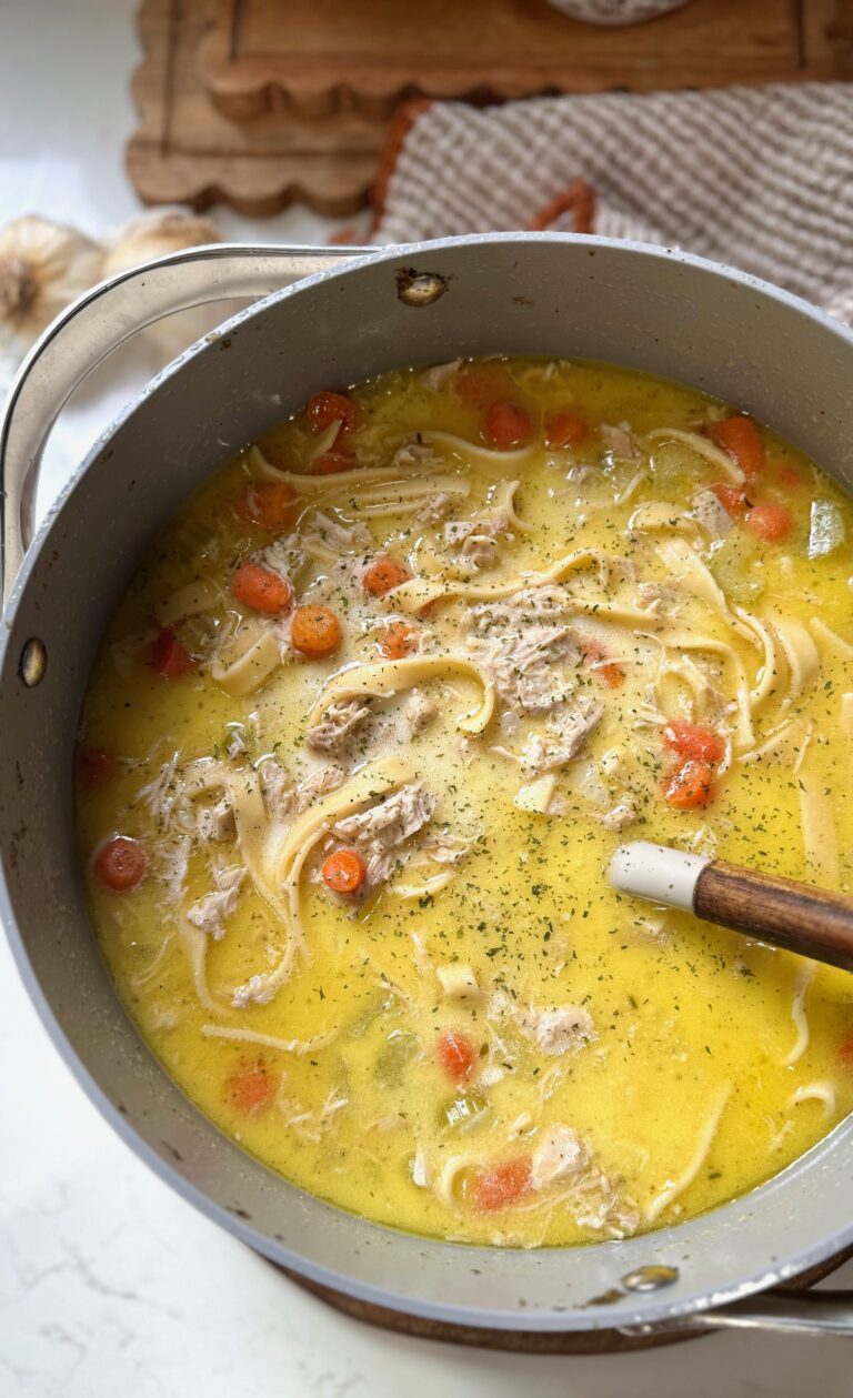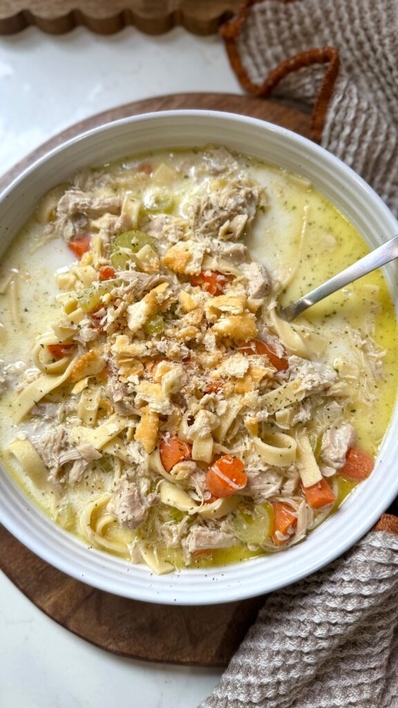 What I love about this version is that it’s completely homemade — no canned broth or shortcuts — yet it’s still simple enough for a weeknight. You start by simmering chicken thighs with water and a few pantry spices, which gives you the richest, most flavorful base. Once you build on that with sautéed veggies, noodles, and cream, you end up with the silkiest, dreamiest soup ever.