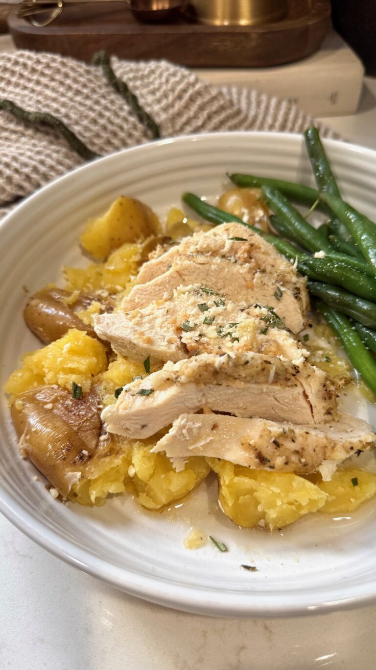 Everything goes straight into the crockpot in the morning — whole baby Yukons, chicken breasts, a quick homemade garlic Parmesan sauce — and by dinnertime, the kitchen smells incredible, the chicken’s tender, and the potatoes are buttery and soft.