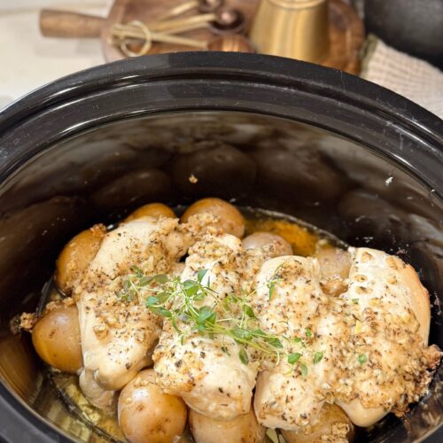 This Crockpot Garlic Parmesan Chicken and Potatoes is the coziest set-it-and-forget-it meal. Tender chicken breasts and buttery baby Yukon potatoes slow cook in a creamy garlic Parmesan sauce until perfectly golden and flavorful. Simple, family-friendly, and made for busy weeknights.