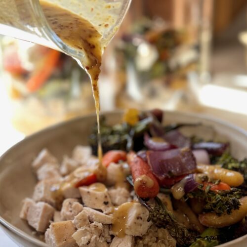 • Assemble bowls: divide quinoa, roasted veggies, 4 oz chicken, ½ oz feta, and 2 Tbsp Rustic Honey Mustard Dressing into 5 airtight containers. I like to layer it in a jar with dressing at the bottom, then quinoa, chicken, veggies and feta.