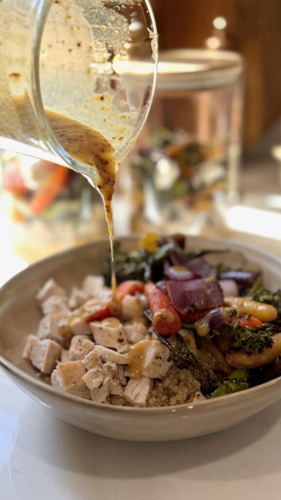 Can we talk about this Rustic Honey Mustard Dressing for a second? It’s everything. Tangy Dijon, a little whole grain mustard for texture, apple cider vinegar, and a touch of honey. I cut back the olive oil in the batch so it’s a little lighter, but you still get that silky, restaurant-style drizzle. I’m not about to sacrifice flavor for macros, and thankfully, I didn’t have to. Two tablespoons per bowl feels indulgent, but with the tweak, it totally fits.