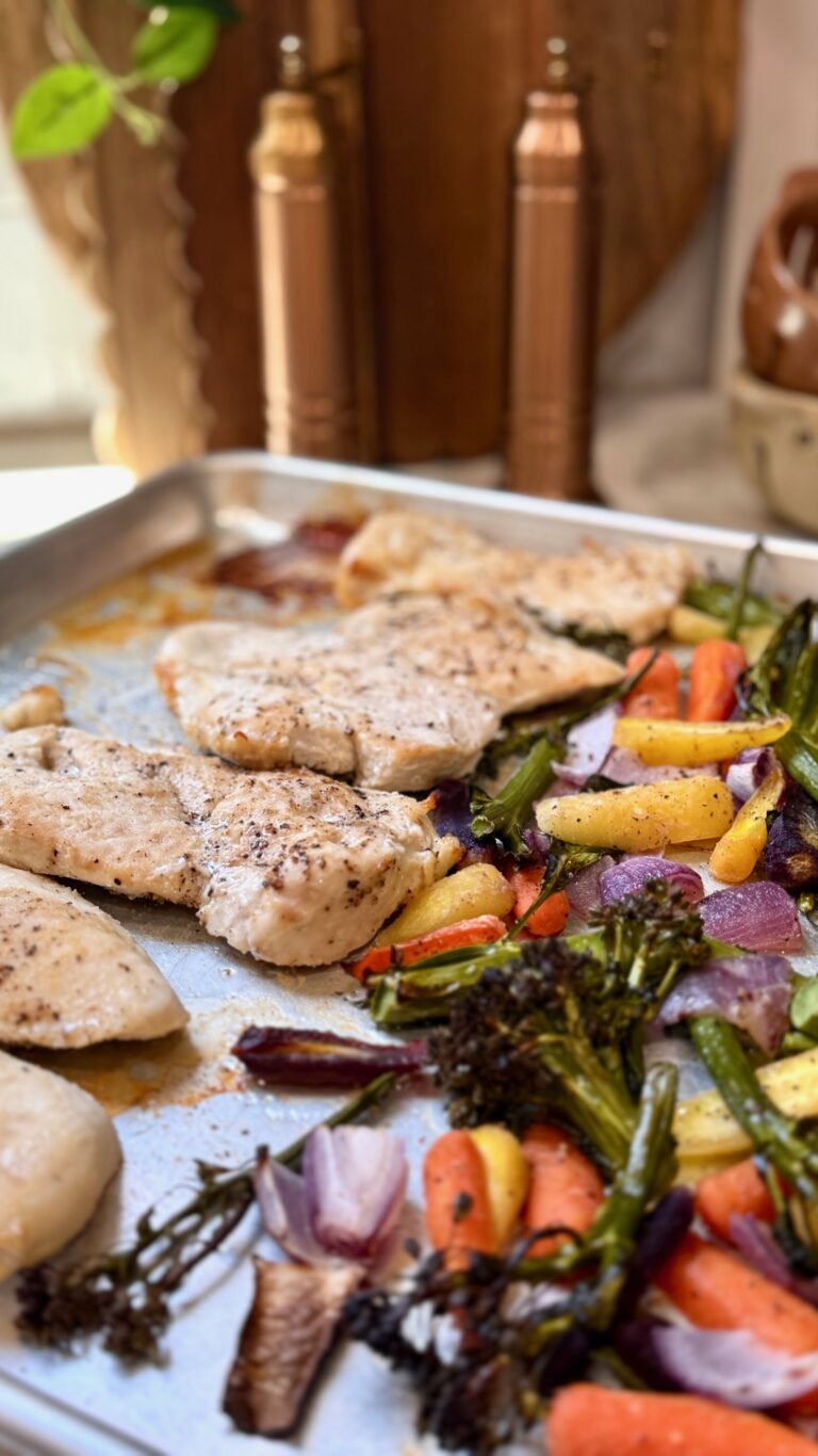 The real magic of this recipe is that everything roasts together on one sheet pan. The chicken, broccolini, rainbow carrots, and onions all cook at the same temperature, which means less cleanup and less time in the kitchen. Just drizzle a little olive oil on the veggies, season everything well, and let the oven do the work.