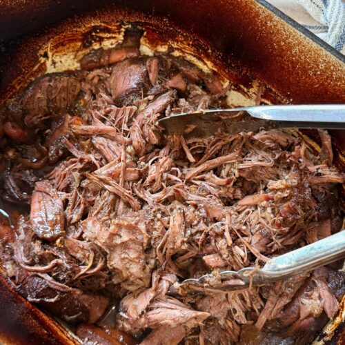 • Bake: Cover and roast 3½–4 hours, or until the meat is fork-tender and easily shredded.