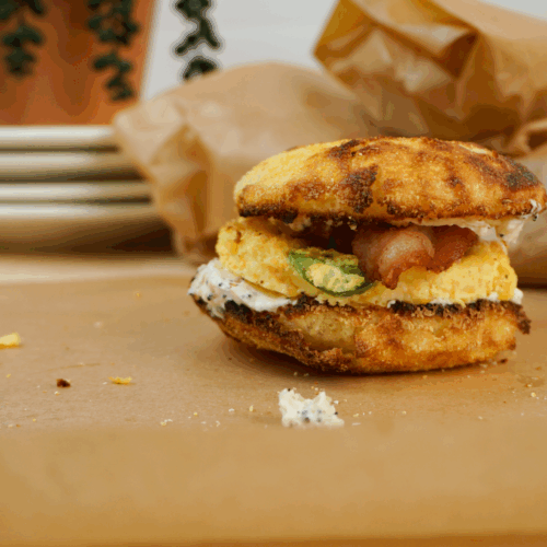 These sandwiches are everything you want in a breakfast — protein-packed, filling, and customizable. The eggs are blended with cottage cheese (trust me on this one!) for extra protein and a creamy texture that reheats beautifully. Add crispy bacon, a sprinkle of cheddar, and a layer of everything bagel cream cheese… and you’ve got the kind of breakfast that makes you feel put-together even when you’re not.