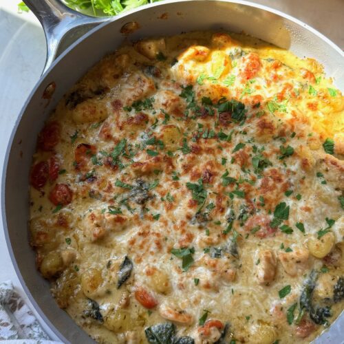 This creamy, cheesy Pesto Chicken Gnocchi Bake is the ultimate 25-minute one-pan dinner. Made with juicy chicken, pillowy gnocchi, cherry tomatoes, and a cozy basil pesto cream sauce, it’s an easy weeknight recipe that feels restaurant-level.
