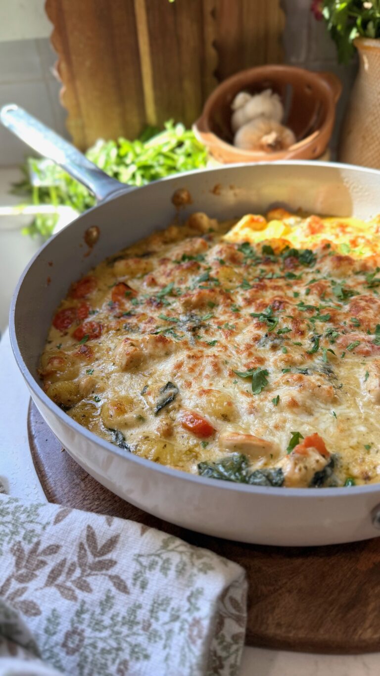 This creamy, cheesy Pesto Chicken Gnocchi Bake is the ultimate 25-minute one-pan dinner. Made with juicy chicken, pillowy gnocchi, cherry tomatoes, and a cozy basil pesto cream sauce, it’s an easy weeknight recipe that feels restaurant-level.