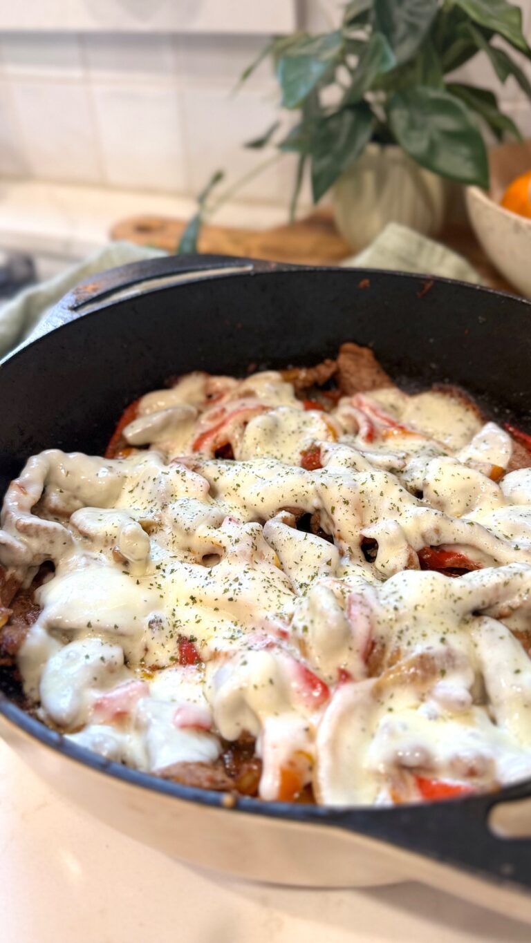 This easy Philly Cheesesteak Skillet skips the bread and potatoes but keeps all the classic flavor. Juicy steak, melty provolone, peppers, and onions come together in one pan for a low-carb, high-protein dinner you’ll crave again and again.