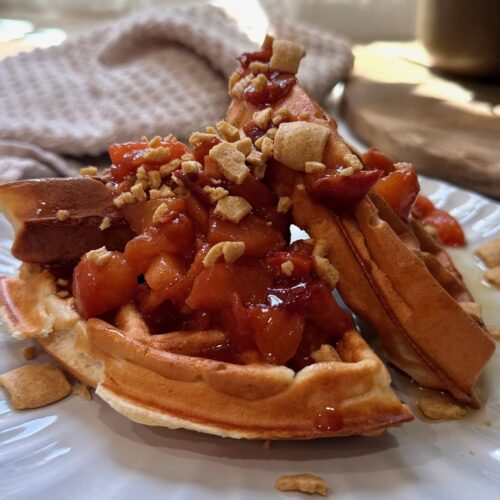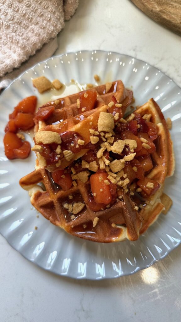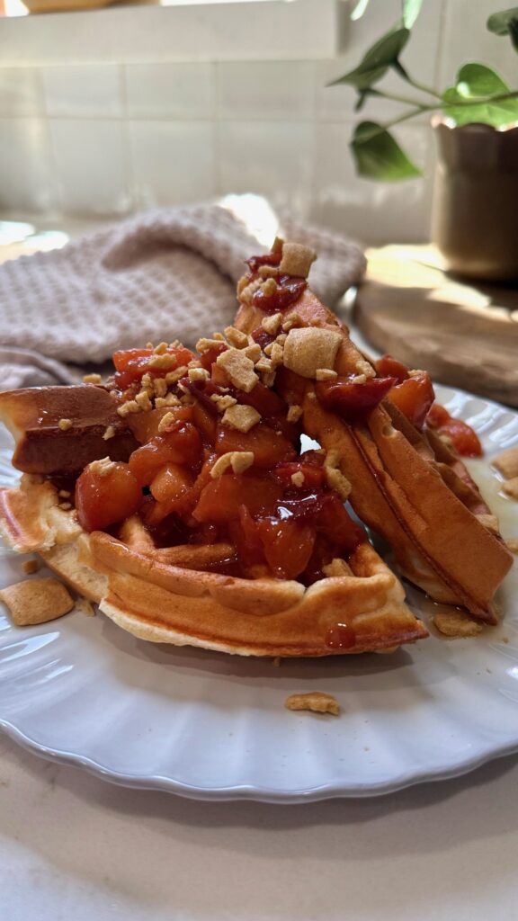 I start with my trusty protein waffle batter (Greek yogurt, eggs, a splash of Fairlife milk, vanilla, flour, and protein powder). It’s the perfect balance of tender and sturdy, so the waffles toast up crisp on the outside and stay soft inside. Then I pile on a quick peach compote—fresh peaches simmered just until jammy—because when peaches are good, you don’t need to do much. To finish, I crush a little Catalina Crunch across the batch for texture. It gives that “crispy, crunchy, creamy” vibe that makes breakfast feel special without turning it into a sugar bomb.