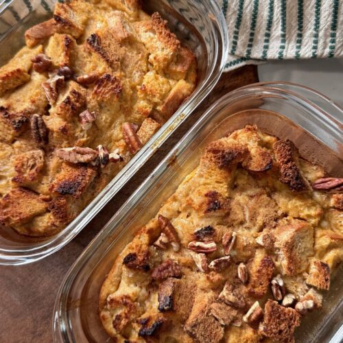 I switched the bread in this version to Dave’s Killer Bread – White Bread Done Right, and I swear it’s perfect for this. The slices are soft and easy to cube, they soak up the custard mixture beautifully, and they bake into this golden, slightly crisp top with a soft center. And using 12 slices gives the perfect ratio — nothing soggy, nothing dry.