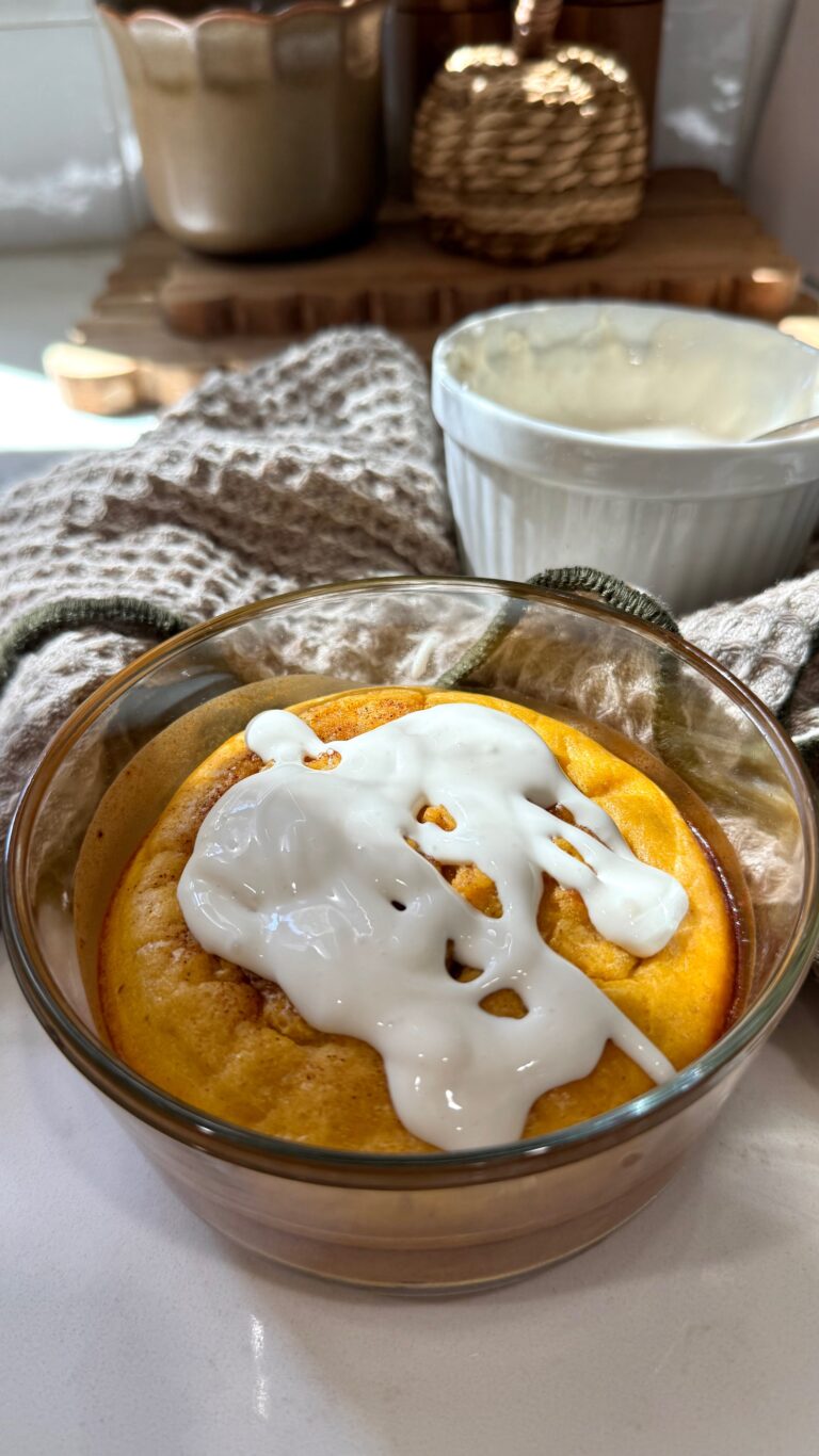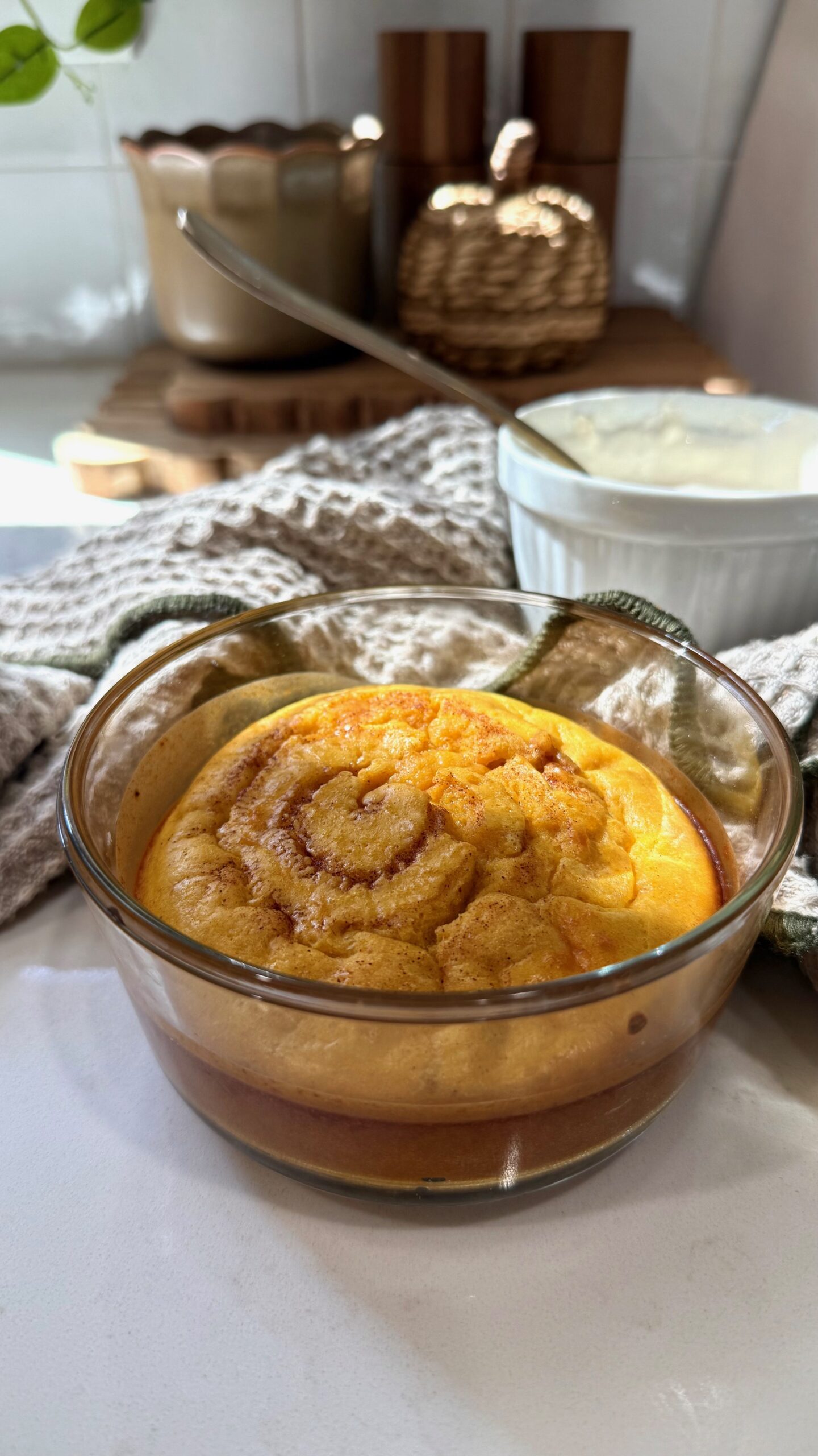 They’re made with my classic base from the cookbook, but I swapped a few things to make them extra cozy and nutrient-packed: Greek yogurt instead of cottage cheese, pumpkin puree instead of applesauce, and an extra scoop of protein powder. The result? A rich, tender baked pancake that tastes like a cross between a pumpkin muffin and a cinnamon roll — all baked right into individual glass meal prep bowls.
