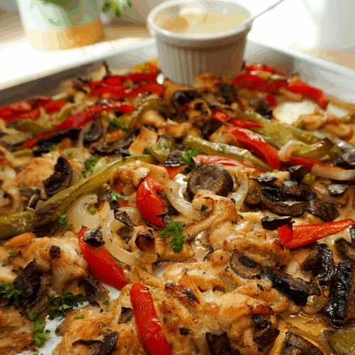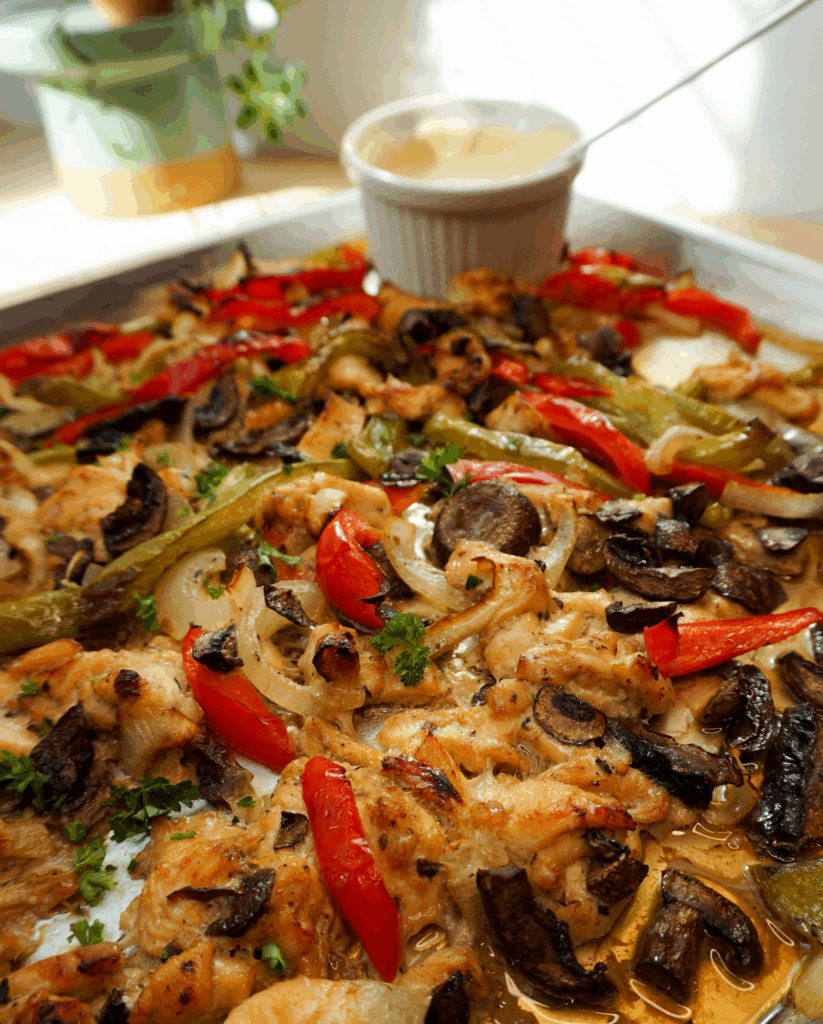 This Sheet Pan Chicken Philly also reheats really well. The chicken stays juicy thanks to the marinade, and the roasted veggies hold up in the fridge. The garlic aioli on top is the cherry on top—it gives you that creamy, indulgent bite that makes the whole dish feel like comfort food, without being heavy.