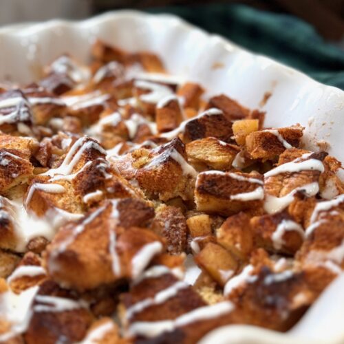 Spoon or slice the French toast bake onto plates and finish with a light drizzle of cream cheese glaze.