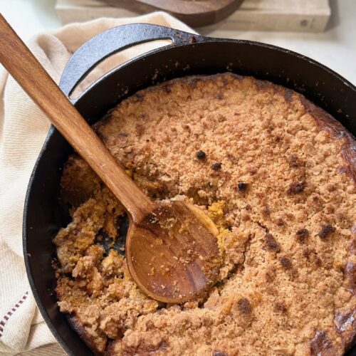 Make the pumpkin layer: In a large bowl, whisk together pumpkin, sugar, eggs, pumpkin pie spice, salt, and vanilla. Whisk in the heavy cream until smooth. Pour into the skillet.